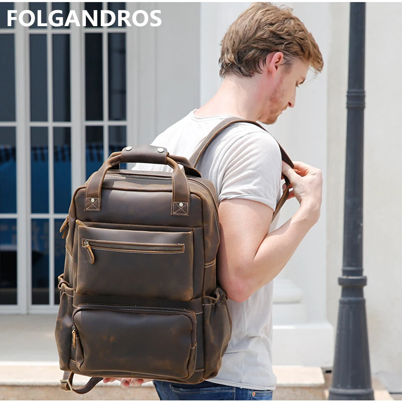 Men's Large Capacity Genuine Leather Backapck Vintage Handmade Thick Cowhide Business 17'' Laptop C