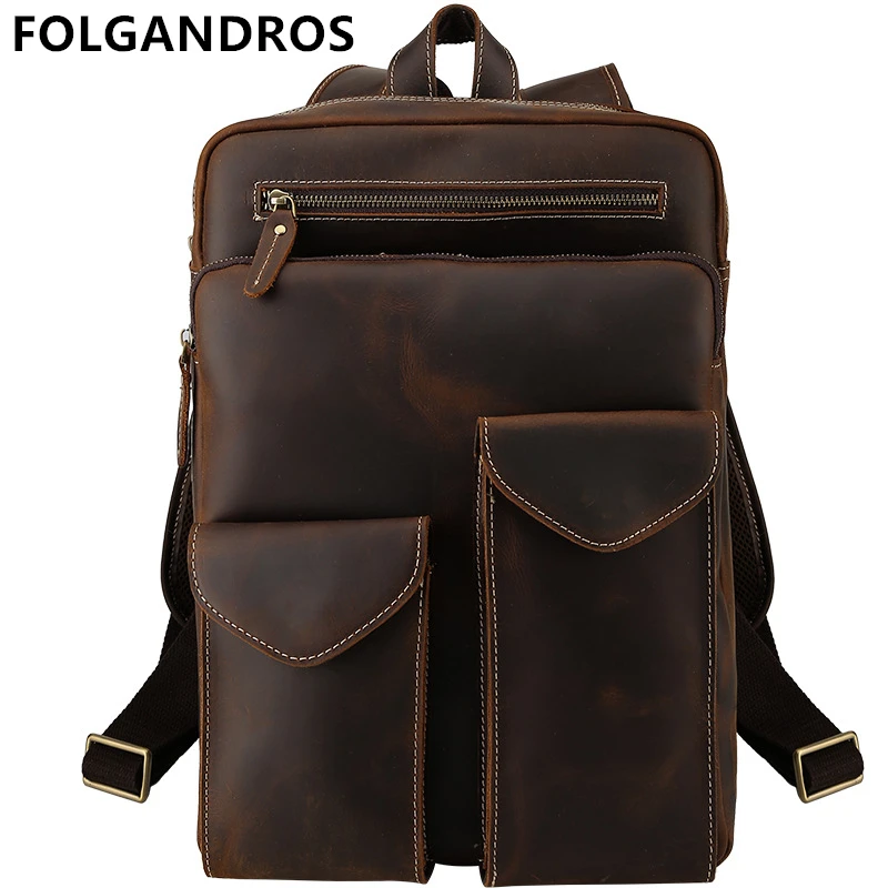 HOT SALE FOLGANDROS Men's Genuine Leather Backpack Handmade Vintage Crazy Horse Leather Backpack Multifuncti