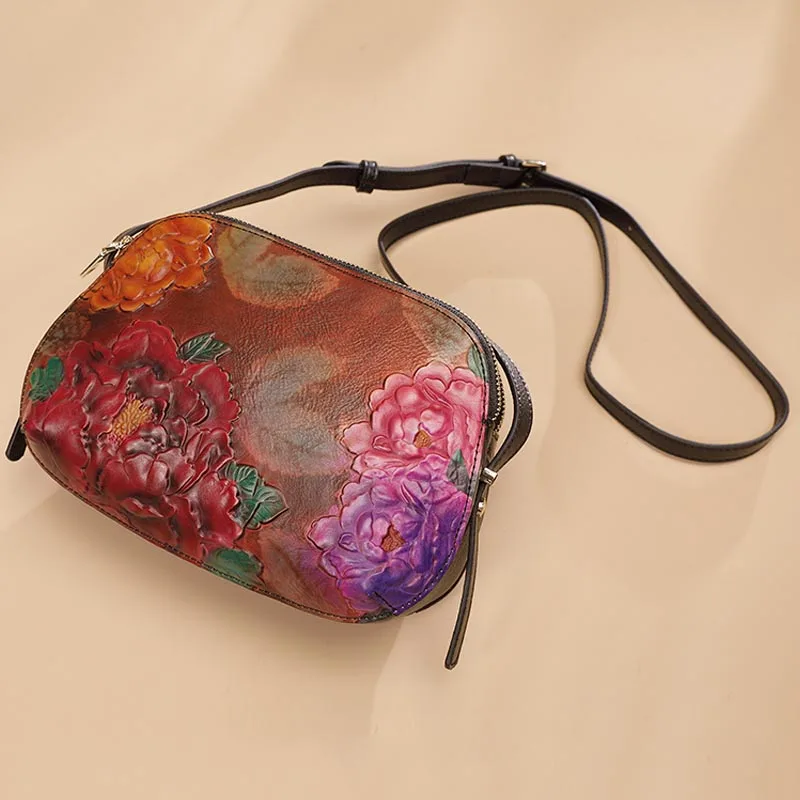 Chinese Style Women Noble Shoulder Bag Genuine Leather Top Leather Peony Flower Pattern Flap Vintag